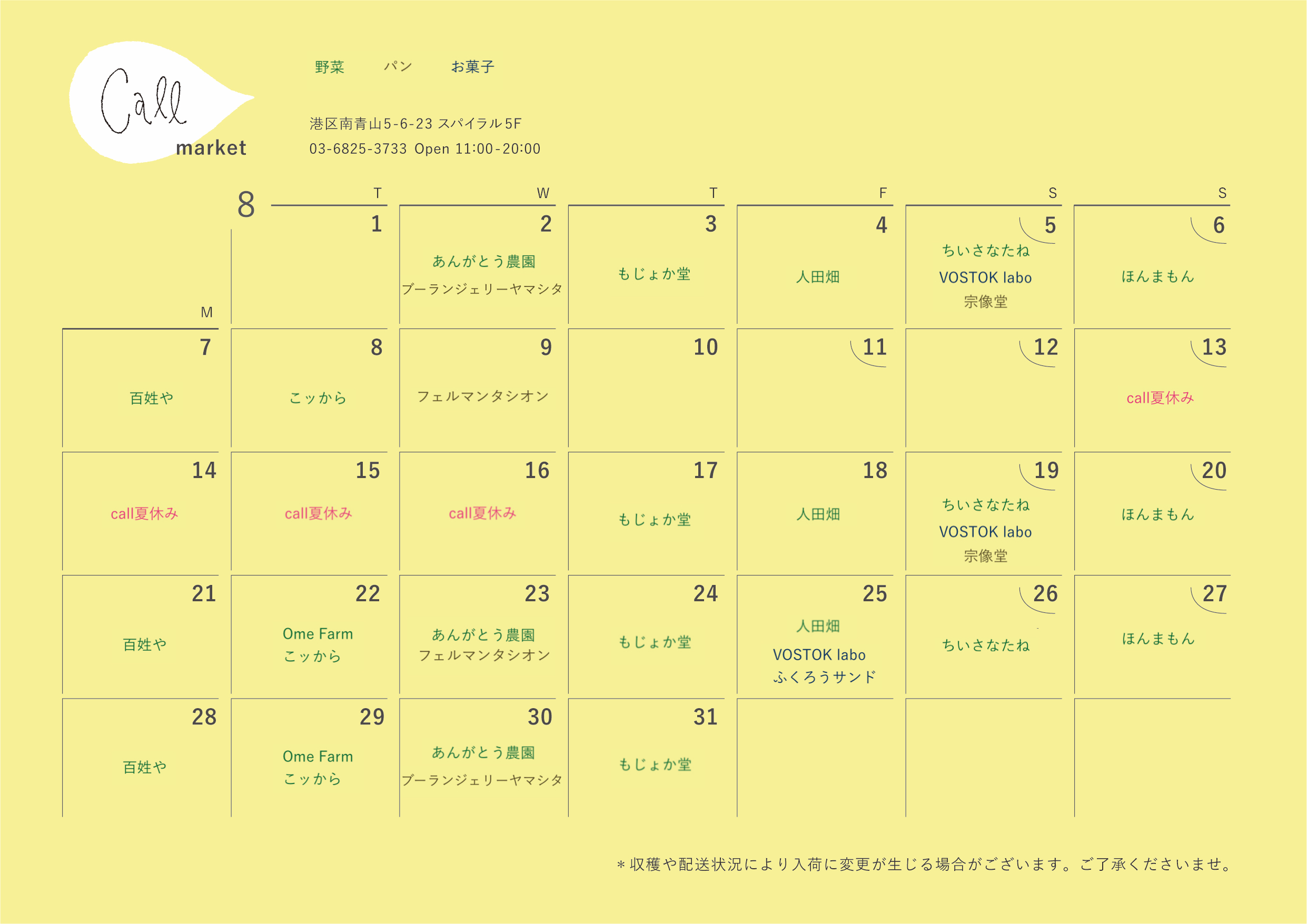 callマーケット入荷情報については、下記のカレンダーをご覧ください。